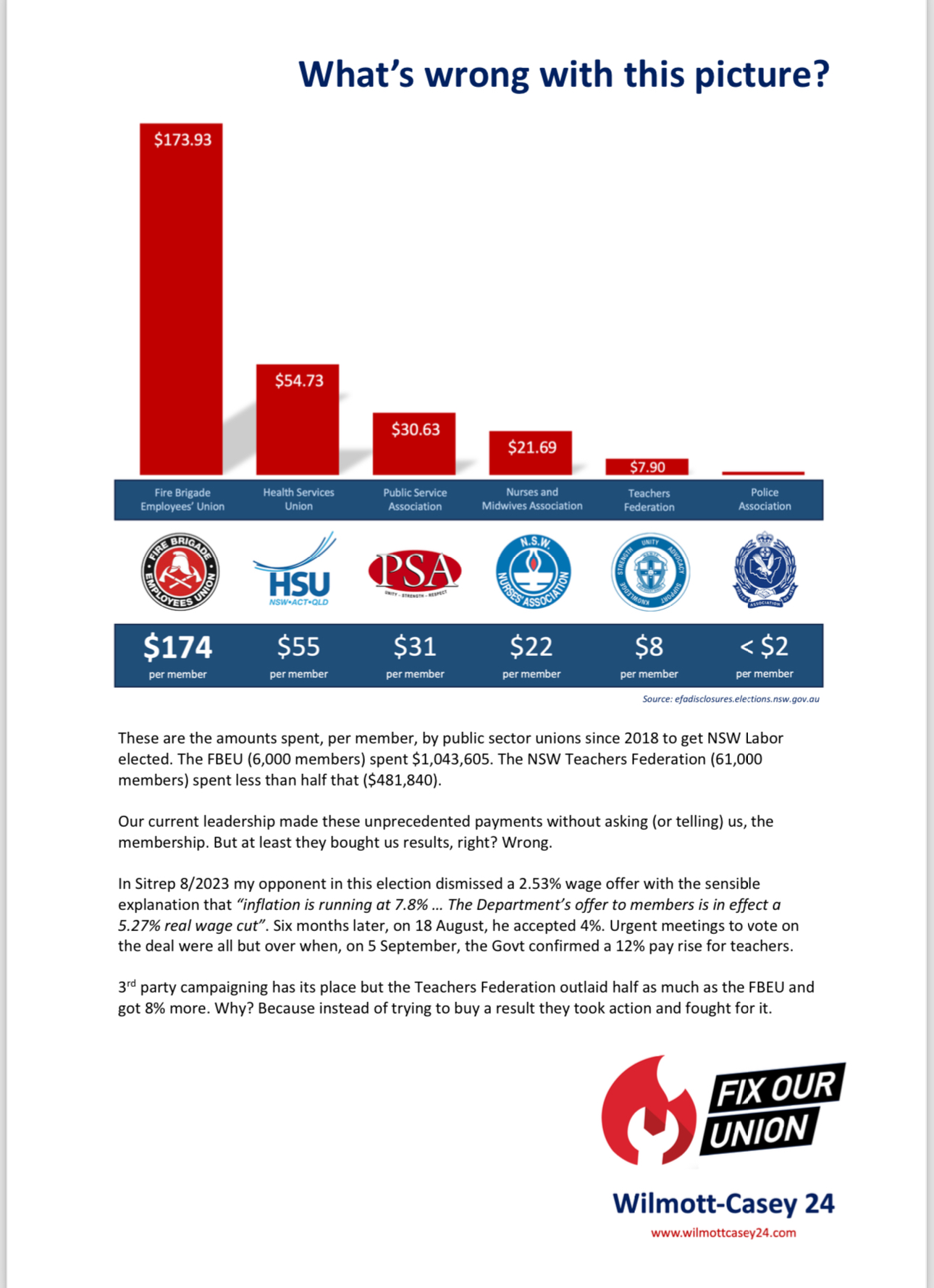 NSW Teachers Federation, 61000 members, spent $480,000. That’s $7.90 per member.